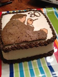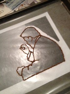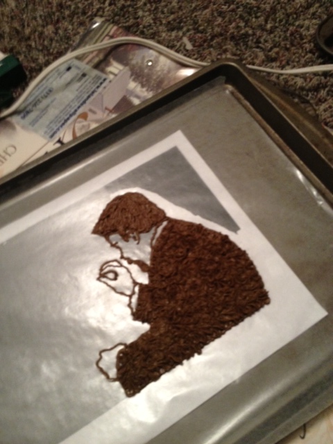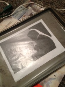 I read a brilliant blog post here about using a a coloring sheet as a template for designing your cake, and I thought, ‘Why not try that with a picture?” So, I printed off a picture in black and white, taped it to a cookie sheet, and taped wax paper over it.
