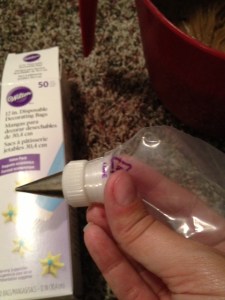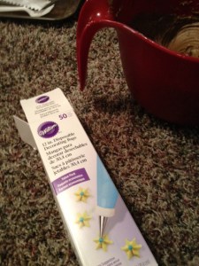 Now would be a good time to mix your icing colors for the next step. The easy way out at this stage is to do words (“Happy Birthday So-and-So!”) and a shell border. Orrrr you can be insane and continue along with me. 😉 Either way, you’ll want these bags…