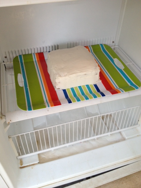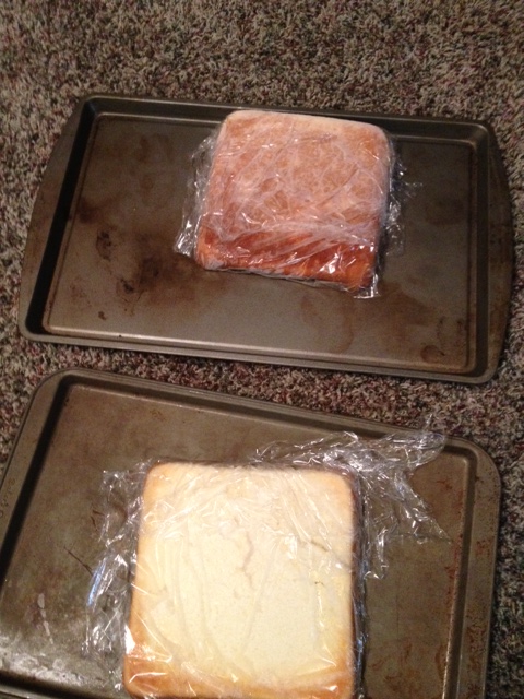 Now for the important part: take saran wrap and stretch it over a cookie sheet. Dump your cake onto that; wrap the cake in the saran wrap. Now go stick it in the freezer for at least overnight. This will make your cake taste super moist.