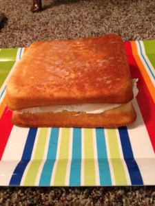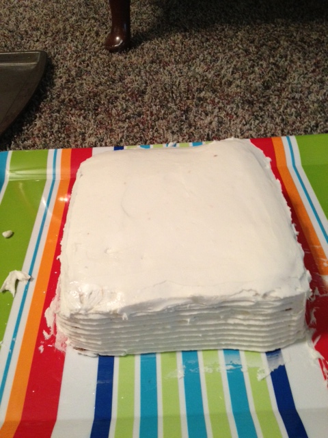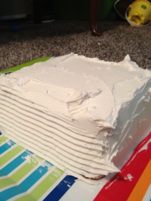 First, go buy your favorite box of cake mix. Bake it according to the instructions in whatever shape pan you choose. I chose to do a double layer square cake this time. After you’ve cooked it accordingly, let it cool for a bit (15 min to an hour-ish.)