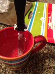 Now, to get your icing smooth on the top, fill a cup or mug with HOT water. Also, buy this spatula. I have two now. You dip the spatula in the hot water and patiently smooth out the icing, working your way from the center out.