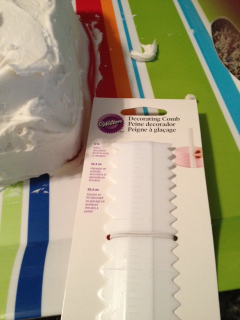 Some people do a crumb layer of icing first–where they do a thin layer of icing and freeze the cake again before applying a final layer of icing. I didn’t have time for this particular cake, so I had to settle with a few crumbs. Anyway, I applied a super thick layer of icing, then I broke out this: