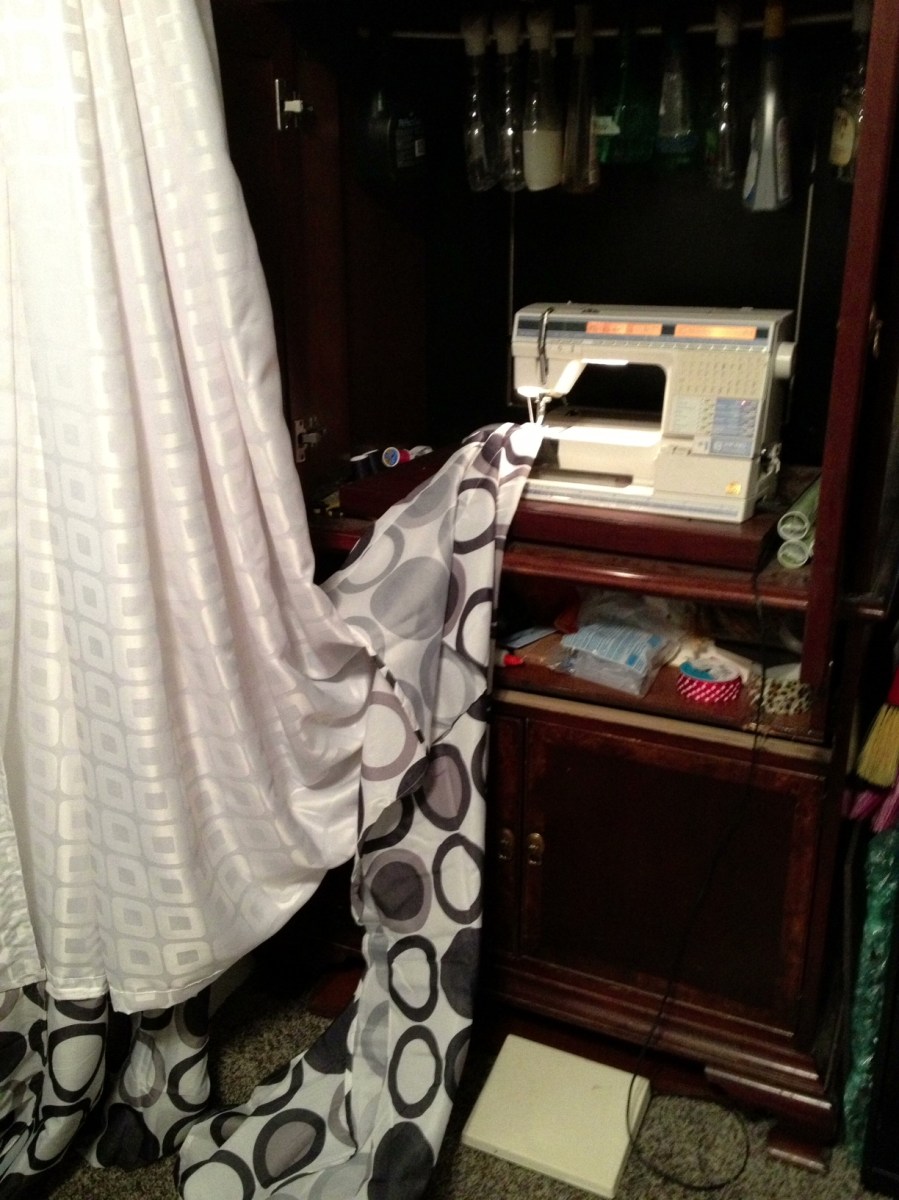 Sewing machine armoire Published February 9, 2013 at 1224 × 1632 in Hanging Curtains… learning from my mistakes ← Previous Next → If you look carefully, you can see my cleaning products hanging above my sewing machine.