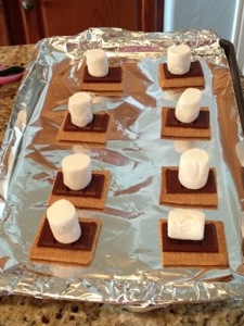 I lay a half graham cracker down, then I placed 1/4 a bar of Hershey’s chocolate on top of that. I finished with a giant marshmallow. I allowed those to cook at 350* for 5-6 minutes. Then, I put the top graham cracker on and flipped the entire s’more over so that the unbaked cracker was resting on the hot pan. I let them cool like that.
