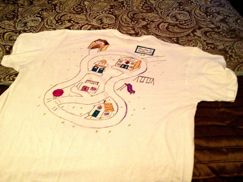 So I wanted this year to be special. I searched and searched for the perfect gift, and I stumbled upon this tutorial that I thought was ABSOLUTELY adorable… a shirt with a little town with roads for the kids to “drive” on, so that the shirt-wearer gets a backrub while the kids play!